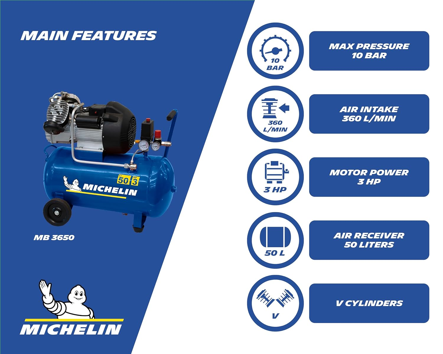 Compresseur d’Air Portatif MICHELIN MB3650 – Cuve 50 L – Moteur 3 CV – 10 Bar – 360 L/min