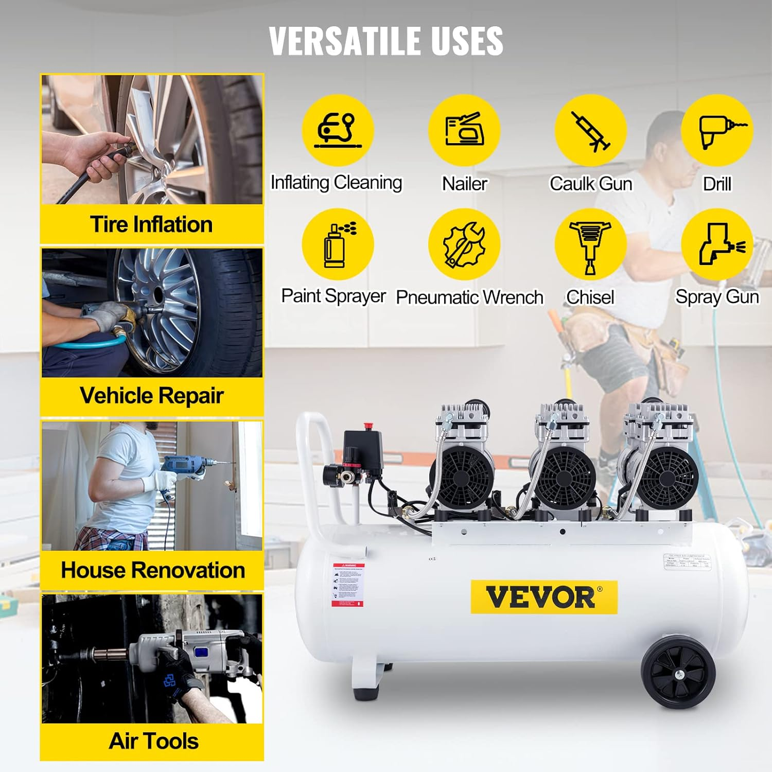 Le compresseur d’air VEVOR 100 L sans huile associe puissance, fiabilité et confort sonore. Sa conception robuste et silencieuse permet de travailler efficacement sans nuisance sonore excessive. Grâce à sa pompe sans huile et à son moteur en cuivre de haute qualité, il offre une excellente durée de vie et des performances constantes.